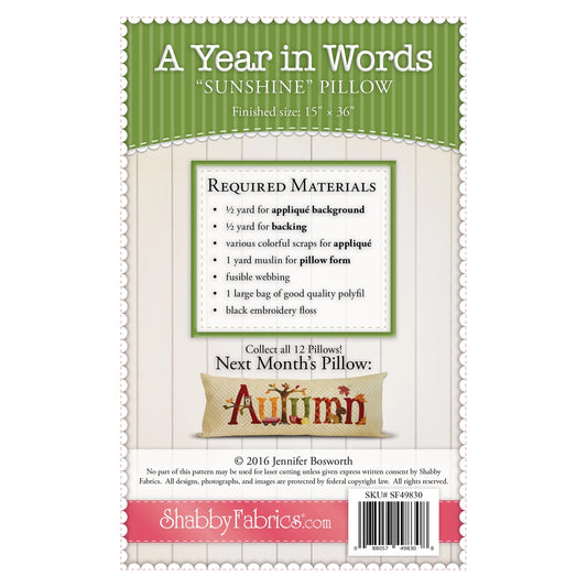 Shabby Fabrics A Year in Words Pillows 8 - You Are My Sunshine - August - Pillow Pattern