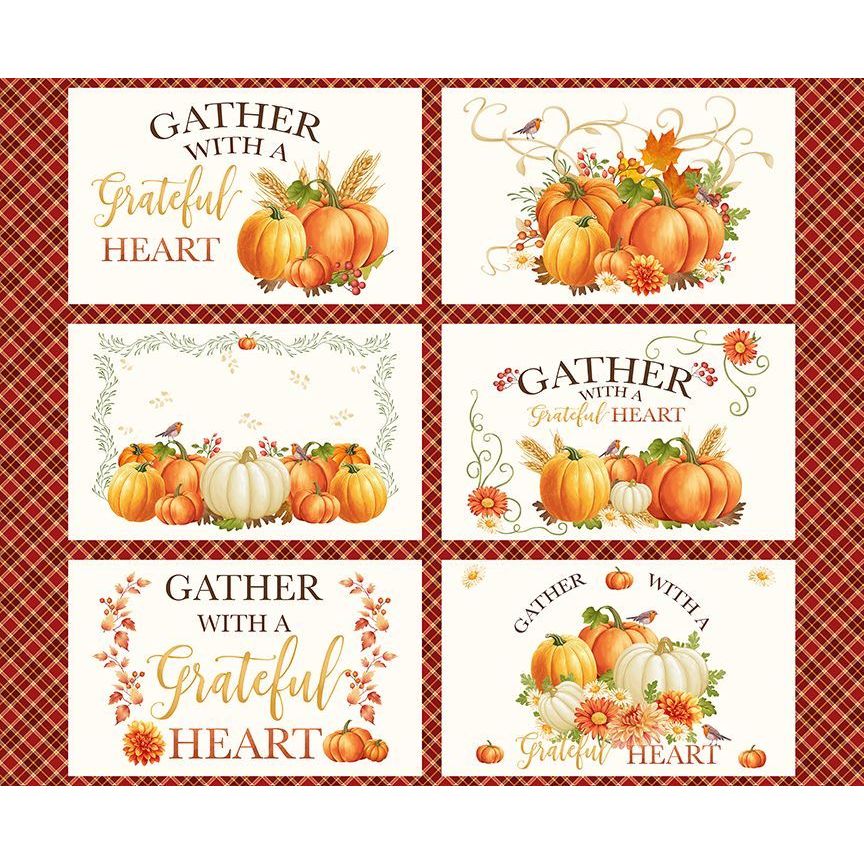 This panel features gorgeous pumpkins, leaves, and mums . Panel size is 36" x 43".