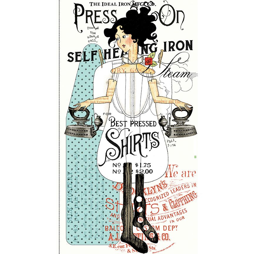 Press On by J. Wecker Frisch for Riley Blake Designs is great for quilting, apparel and home decor. This digitally-printed panel features a girl with ironing implements. Panel size is 24" x 43".