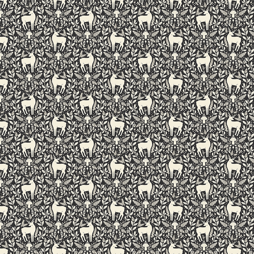 Yuletide Forest by Katherine Lenius for Riley Blake Designs is great for quilting, apparel and home decor. This print features a damask pattern with deer, leaves, mushrooms, and dots.